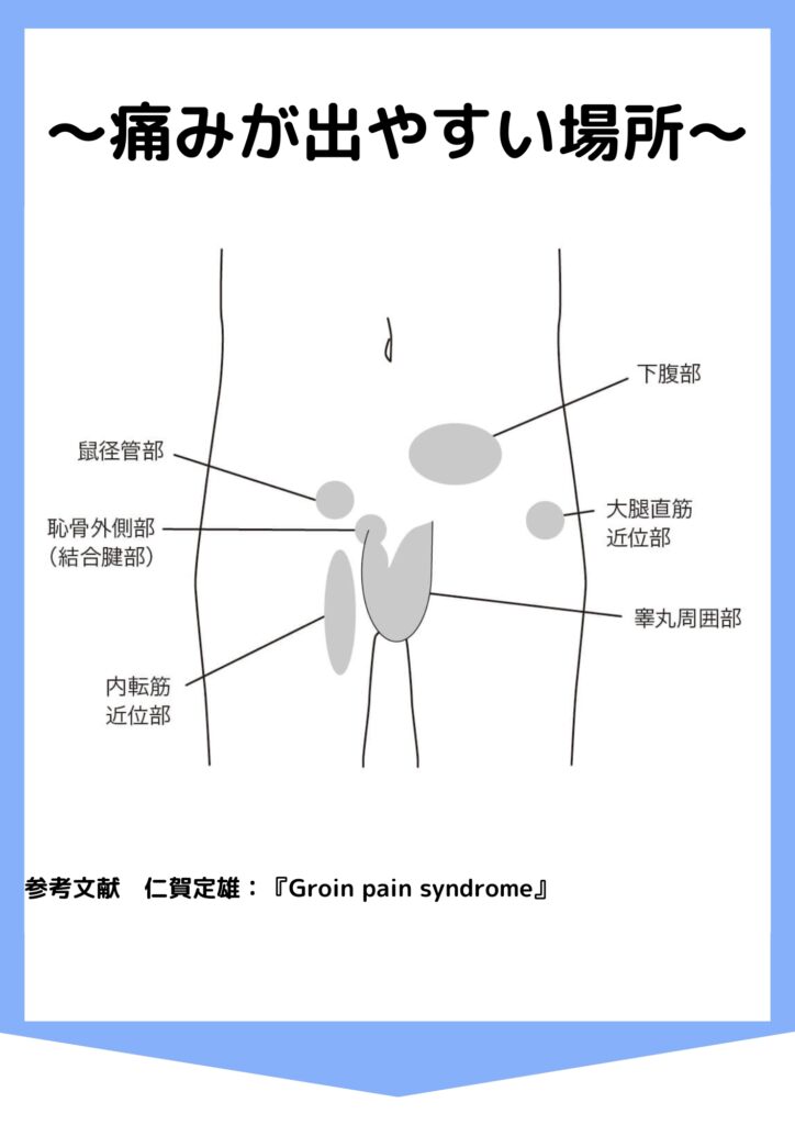 スポーツ選手、特にサッカー選手に多く発生する股関節周囲の痛みです。