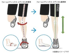 足部を矯正してあげる事で膝や股関節の内曲がりを抑え普段から下肢の真っ直ぐな状態を維持しやすくなります。